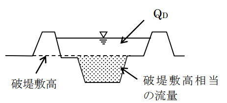 越流公式は当該箇所の河道線形と洪水時のみお筋の関係から、正面越流公式、または、横越流公式を採用する。なお、越流公式による流量は河道流量との収支を考慮していないため過大になることがある。求められた越流量が破堤敷高以上の流量 \(Q_D\) より大きい場合には、\(Q_D\) を最大とする等の注意が必要である。
